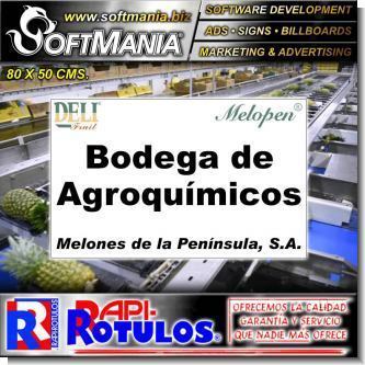 Este producto Rotulo Publicitario PVC 3 Milimetros con Rotulacion Full Color con Texto Bodega de Agroquimicos para Planta Empacadora de Frutas marca Softmania Rotulos de Dimensiones 80x50 Centimetros y muchos mas estan disponibles al por mayor y al detalle en SOFTMANIA. Pregunta por el codigo SMRR23090402. Aprovecha grandiosas ofertas todos los dias!