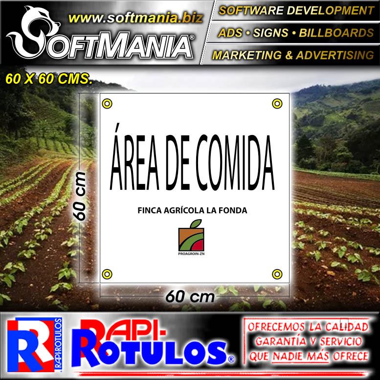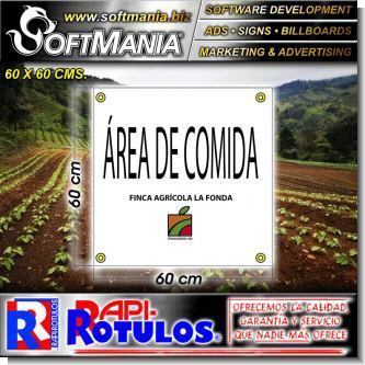 Este producto Material Publicitario Lamina de Hierro con Rotulado de Vinil Adhesivo Full Color con Texto Area de Comida para Finca Agricola marca Softmania Rotulos de Dimensiones 60x60 Centimetros y muchos mas estan disponibles al por mayor y al detalle en SOFTMANIA. Pregunta por el codigo SMRR23102509. Aprovecha grandiosas ofertas todos los dias!