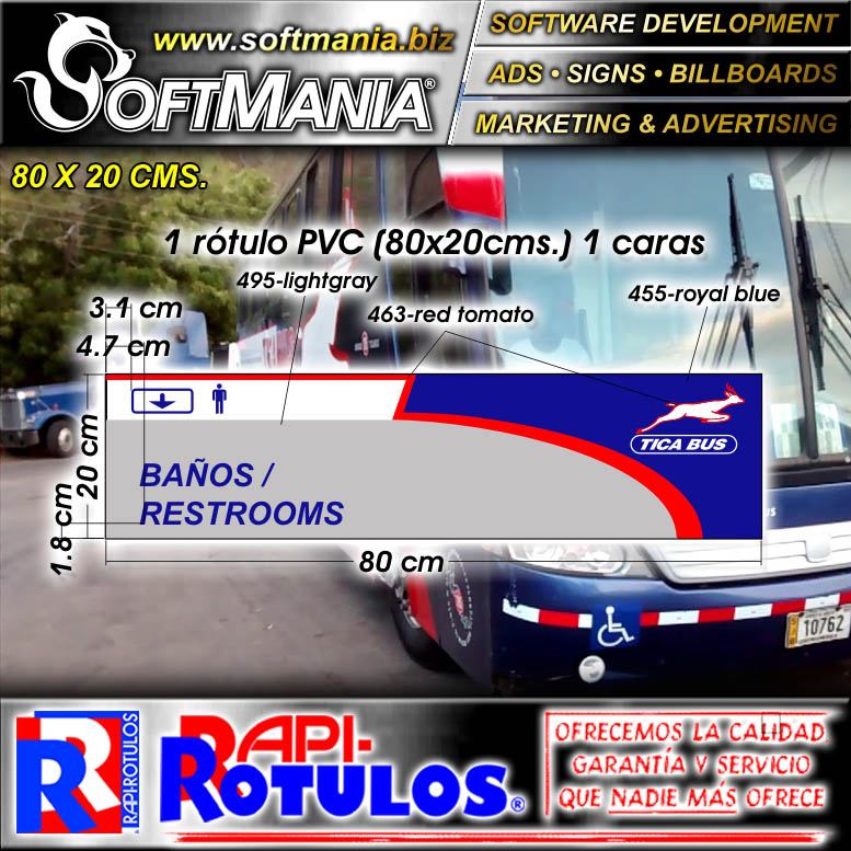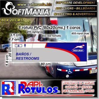 Este producto Material Publicitario Prefabricado PVC 3 Milimetros con Texto Banos para Empresa de Autobuses marca Softmania Rotulos de Dimensiones 80x20 Centimetros y muchos mas estan disponibles al por mayor y al detalle en SOFTMANIA. Pregunta por el codigo SMRR23102513. Aprovecha grandiosas ofertas todos los dias!