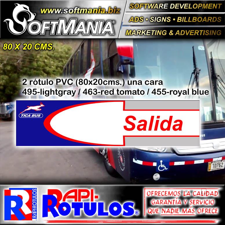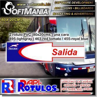 Este producto Material Publicitario Plastico PVC 3 Milimetros con Rotulacion en Vinil de Corte con Texto Salida para Empresa de Autobuses marca Softmania Rotulos de Dimensiones 80x20 Centimetros y muchos mas estan disponibles al por mayor y al detalle en SOFTMANIA. Pregunta por el codigo SMRR23102519. Aprovecha grandiosas ofertas todos los dias!