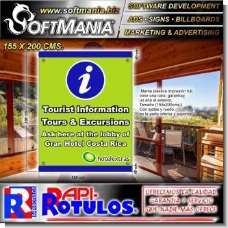 Este producto Material Publicitario Banner Roller up Impresion Full Color con Texto Informacion Turistica, Tours y Excursiones para Hotel marca Softmania Advertising de Dimensiones 1.6x2 Metros y muchos mas estan disponibles al por mayor y al detalle en SOFTMANIA. Pregunta por el codigo SMRR24012938. Aprovecha grandiosas ofertas todos los dias!