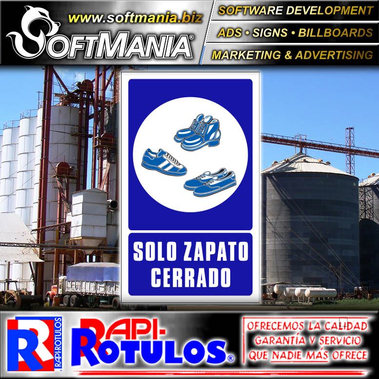 Este producto ROTULO PUBLICITARIO PVC 3 MILIMETROS CON ROTULACION FULL COLOR CON TEXTO SOLO ZAPATO CERRADO PARA FABRICA DE ALIMENTOS MARCA SOFTMANIA ROTULOS DE DIMENSIONES 30X50 CENTIMETROS y muchos mas estan disponibles al por mayor y al detalle en SOFTMANIA. Pregunta por el codigo SMRR23082915. Aprovecha grandiosas ofertas todos los dias!