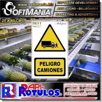 Este producto Rotulo Publicitario PVC 3 Milimetros con Rotulacion Full Color con Texto Peligro Camiones para Planta Empacadora de Frutas marca Softmania Rotulos de Dimensiones 25x40 Centimetros y muchos mas estan disponibles al por mayor y al detalle en SOFTMANIA. Pregunta por el codigo SMRR23090343. Aprovecha grandiosas ofertas todos los dias!
