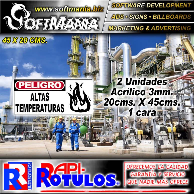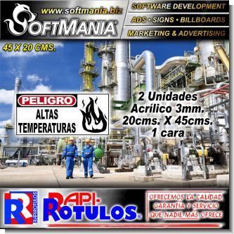 Este producto Material Publicitario Acrilico Blanco 3 Milimetros con Rotulacion en Vinil de Corte con Texto Peligro, Altas Temperaturas para Fabrica de Quimicos marca Softmania Rotulos de Dimensiones 45x20 Centimetros y muchos mas estan disponibles al por mayor y al detalle en SOFTMANIA. Pregunta por el codigo SMRR23100327. Aprovecha grandiosas ofertas todos los dias!