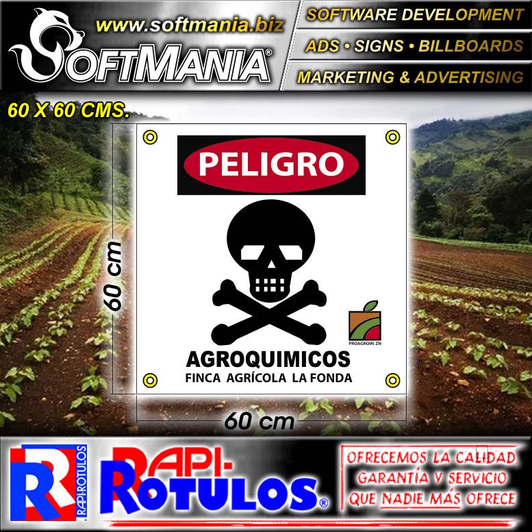 Este producto Material Publicitario Lamina de Hierro con Rotulado de Vinil Adhesivo Full Color con Texto Peligro Agroquimicos para Finca Agricola marca Softmania Rotulos de Dimensiones 60x60 Centimetros y muchos mas estan disponibles al por mayor y al detalle en SOFTMANIA. Pregunta por el codigo SMRR23102512. Aprovecha grandiosas ofertas todos los dias!