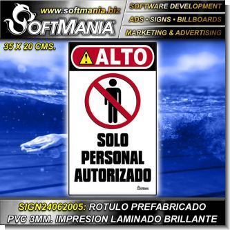 Este producto Material Publicitario Prefabricado PVC 3 Milimetros con Texto Alto Solo Personal Autorizado para Asociacion Deportiva marca Softmania Ads de Dimensiones 35x20 Centimetros y muchos mas estan disponibles al por mayor y al detalle en SOFTMANIA. Pregunta por el codigo SIGN24062005. Aprovecha grandiosas ofertas todos los dias!