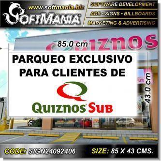 Este producto Material Publicitario Lamina de Hierro con Rotulado de Vinil Adhesivo Full Color con Texto Parqueo Exclusivo para Clientes de Quiznos para Restaurante marca Softmania Ads de Dimensiones 85x43 Centimetros y muchos mas estan disponibles al por mayor y al detalle en SOFTMANIA. Pregunta por el codigo SIGN24092406. Aprovecha grandiosas ofertas todos los dias!