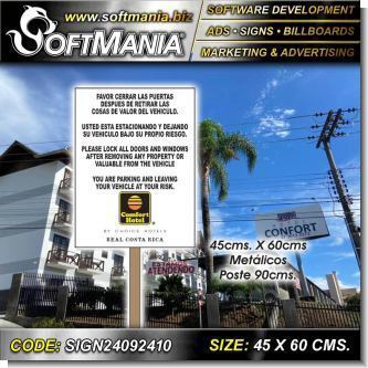 Este producto Material Publicitario Lamina de Hierro con Rotulado de Vinil de Corte con Marco y Poste de Tubo de Hierro con Texto Usted Esta Estacionando Su Vehiculo Bajo Su Propio Riesgo para Hotel marca Softmania Ads de Dimensiones 45x60 Centimetros y muchos mas estan disponibles al por mayor y al detalle en SOFTMANIA. Pregunta por el codigo SIGN24092410. Aprovecha grandiosas ofertas todos los dias!