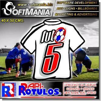 Este producto Material Publicitario Estampado en Serigrafia Sobre Camisetas y Uniformes con Texto Futbol 5 para Evento Deportivo marca Softmania Rotulos de Dimensiones 40x50 Centimetros y muchos mas estan disponibles al por mayor y al detalle en SOFTMANIA. Pregunta por el codigo SMRR23102525. Aprovecha grandiosas ofertas todos los dias!